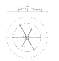 庫頂生料分配是用于生料庫或水泥庫的庫頂作為均勻布料的設備,來自提升機等輸送設備輸送過來的干燥粉狀物料,注入分配罐內(nèi),經(jīng)充氣成流化狀態(tài),通過徑向伸出的空氣輸送斜槽向各點分布,形成多點分料。庫頂物料的分配一般以分配罐直徑作為型號規(guī)格,根據(jù)其出料咀數(shù)量可分為四咀、六咀、八咀三種分配形式,出料咀斜度可按工藝在6°至10°范圍內(nèi)選擇,分配生料能力在技術參數(shù)表中選取。